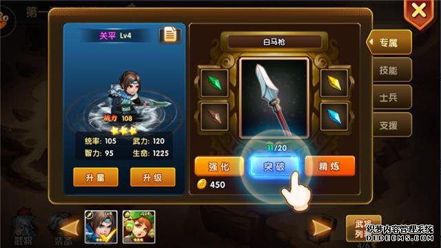 人物技能的提升和新的游戏元素的解锁都会随着相应关卡的胜利而升级、解锁。每当解锁一个新功能你的三国战队就会多一个提升战力的途径,,玩家也会相应的多一份游戏乐趣。不仅如此,随着每场战斗的胜利,你还可以获得相应的金币或升级强化材料。好好利用这些资源将会给你的三国争霸之路带来巨大的帮助。